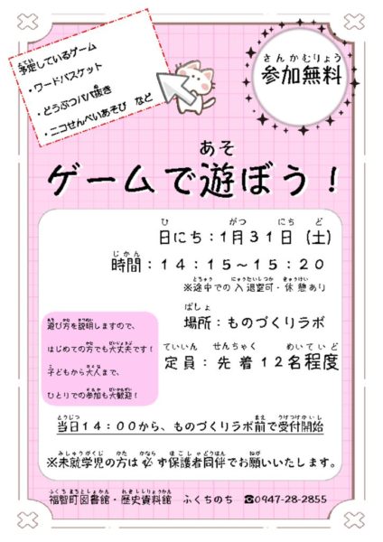 【当日申込み】1/31(土)〈14:00より受付〉ゲームで遊ぼう!
