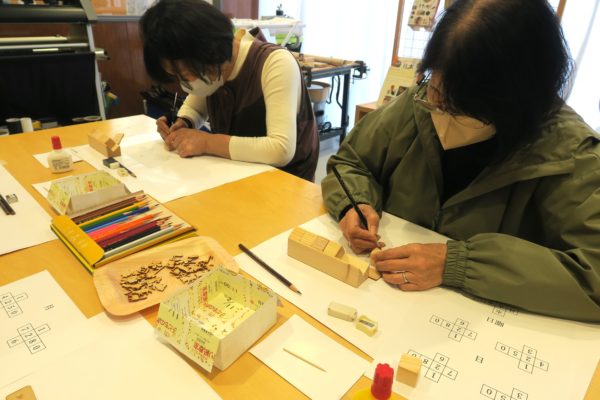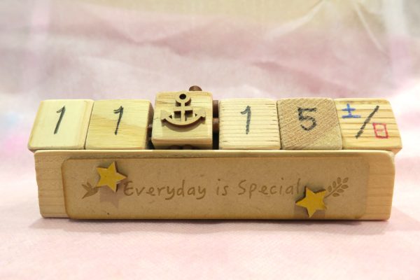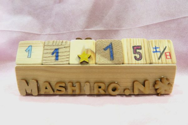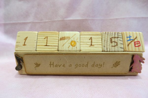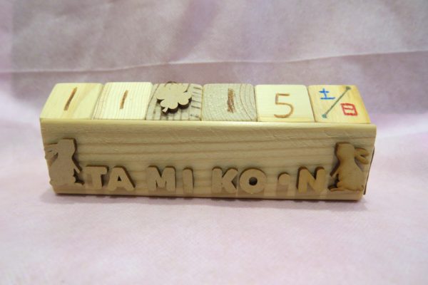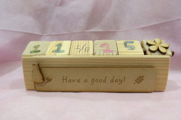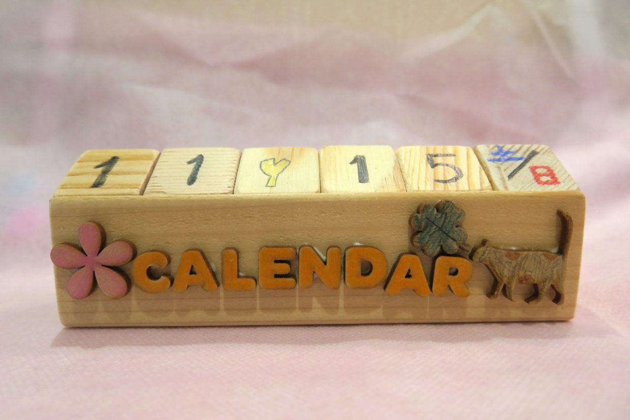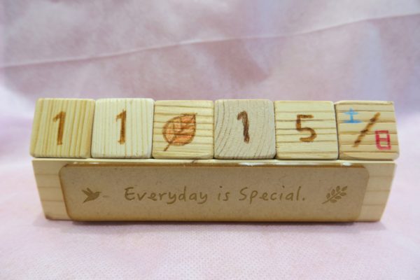 一辺の長さが約24mmの小さな木製のキューブに、色鉛筆で数字や曜日を書き込んでいきます。