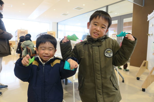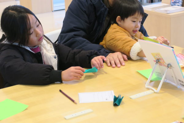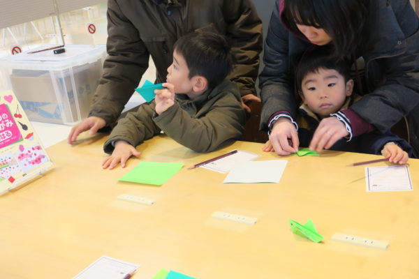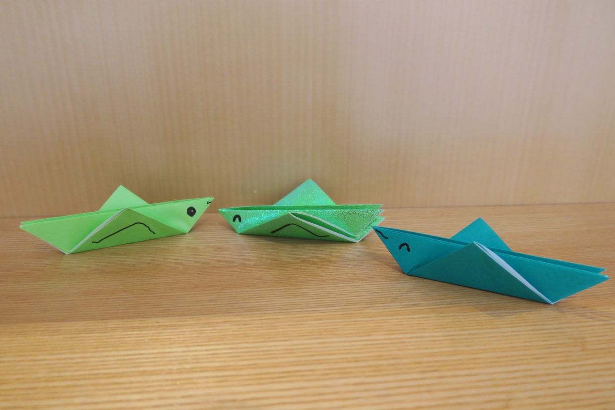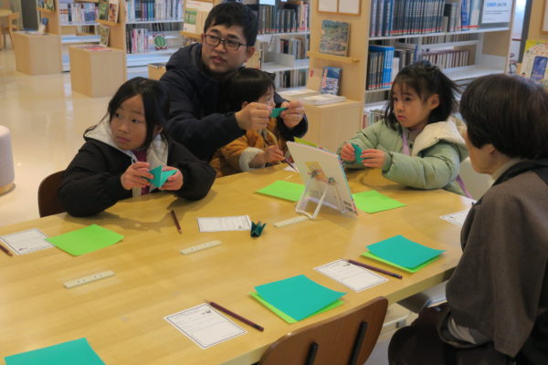 1月の子どもの折り紙教室は、折ったあとで遊べる『くるりんバッタ』を折りました。