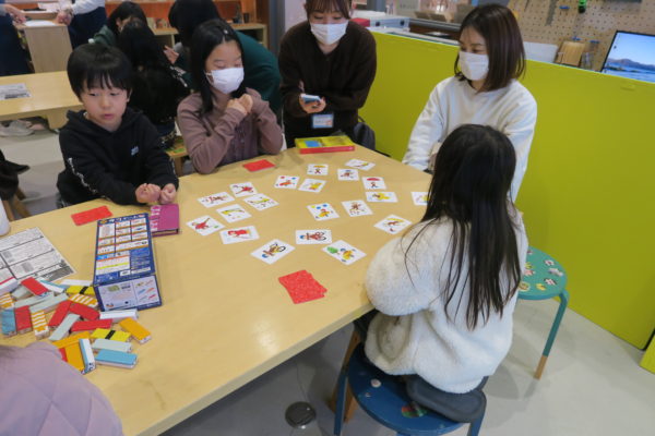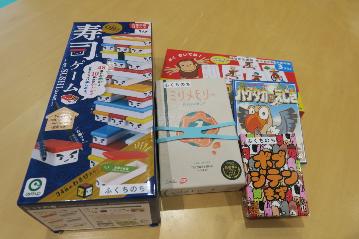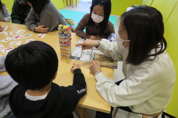 こちらは、【おさるのジョージ スリーヒントかるた】です。読み上げた3つのヒントに合うカードを、素早く探すカードゲームです。絵と文のマッチングが鍛えられます。
